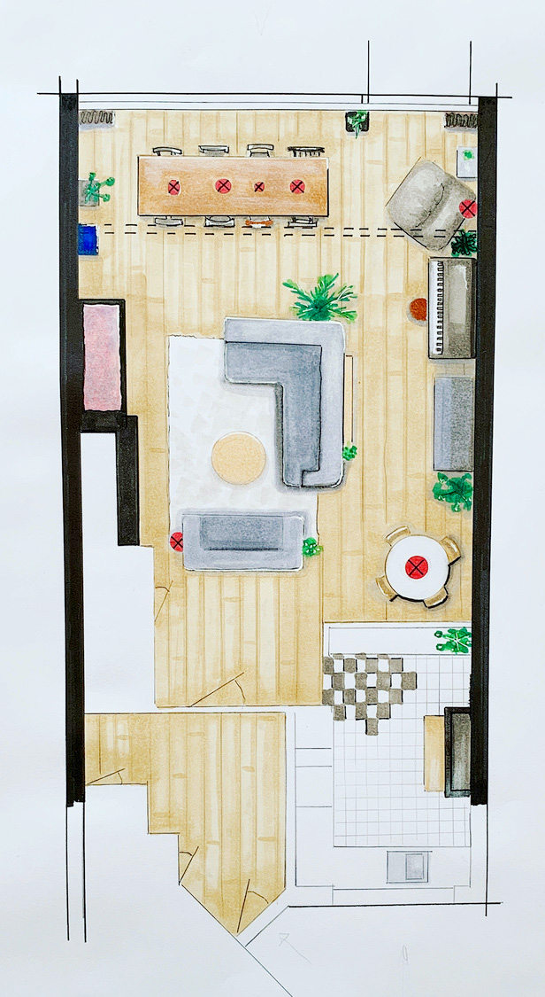 “Wat staat er op die vloer? De kenmerkende titel van onze appgroep waarin we uiteindelijk onze hele woonkamer restyleden. Het begon allemaal met die vloer, historisch oude houten planken, die we samen uitzochten in november 2021, Marcelle kwam met de tip. We constateerden dat we jaren geleden gewoon onze spullen op die oude vloer hadden neergezet en er waren gaan wonen, maar hoe leefden we nou eigenlijk in die kamer en wat vraagt dat dan van de indeling en de spullen? Wij en de kinderen maakten allemaal een eigen moodboard en Marcelle maakte op basis daarvan een vlekkenplan. En zo bleef eigenlijk niets meer hetzelfde. Marcelle struinde tig (online) plekken af en presenteerde de mooiste vondsten. Een zeldzame geëmailleerde koffiepot met chinoiserie afbeeldingen van Willow uit 1930? Ja hoor toe maar! Altijd passend bij stijl, duurzaamheid en budgettaire afspraken en met een maximaal oog voor afwerking bij Marcelle. Onze eigen verhalen kregen een nieuw lijstje en werden samen 1. We droogden bloemen en maakten nieuwe verhalen met herbariumvazen. Onze woonkamer wordt nu veel meer gebruikt, is veel meer een geheel met onze keuken en tuin en straalt bovenal de warmte en liefde uit die we als gezin hierin opzoeken met elkaar!”