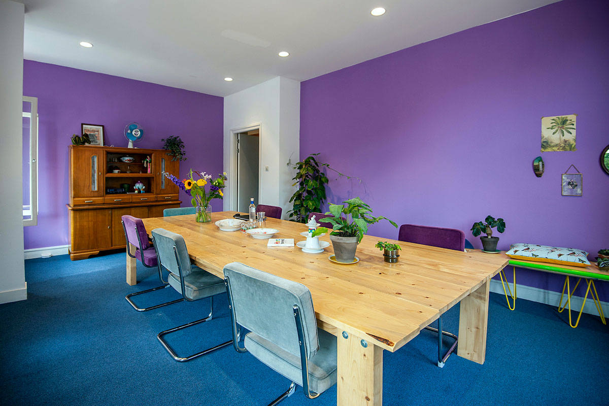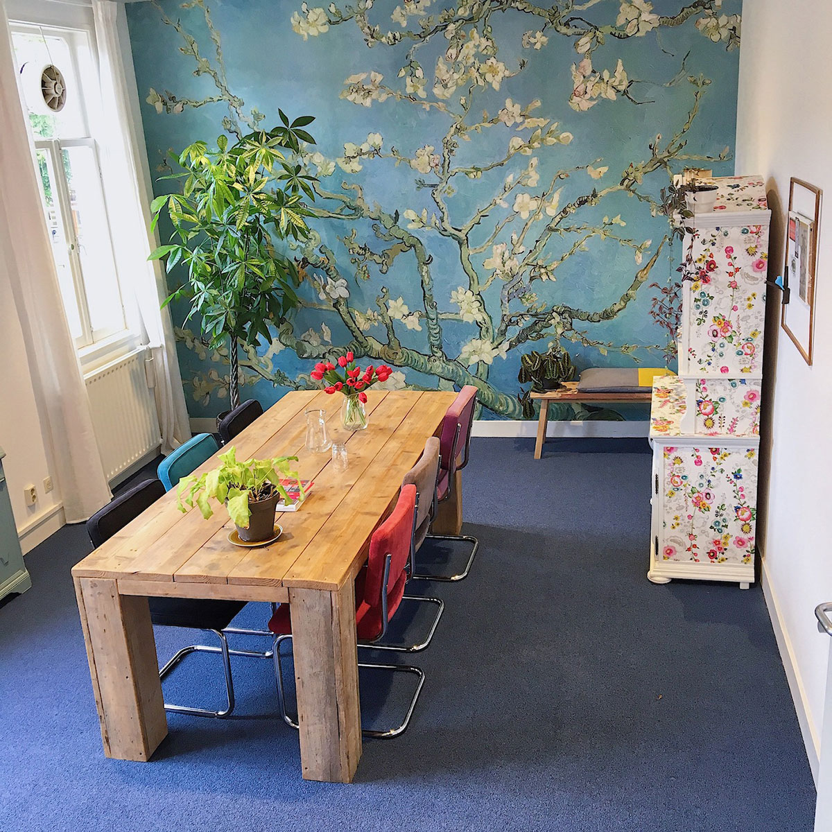 De vraag voor dit kantoor was een interieur vol karakter, contrast en een flinke dosis eigenheid. Geen standaard werkplekken, maar een speelse en inspirerende werkomgeving waar sfeer en creativiteit de boventoon voeren. Op verzoek van de opdrachtgevers is vrijwel alles is vintage of ge-upcycled –van een bankje gemaakt van een oude surfplank tot een wereldbol die een tweede leven kreeg als sierlijke lamp. Juist die persoonlijke, onverwachte elementen vertellen het verhaal van dit bedrijf.