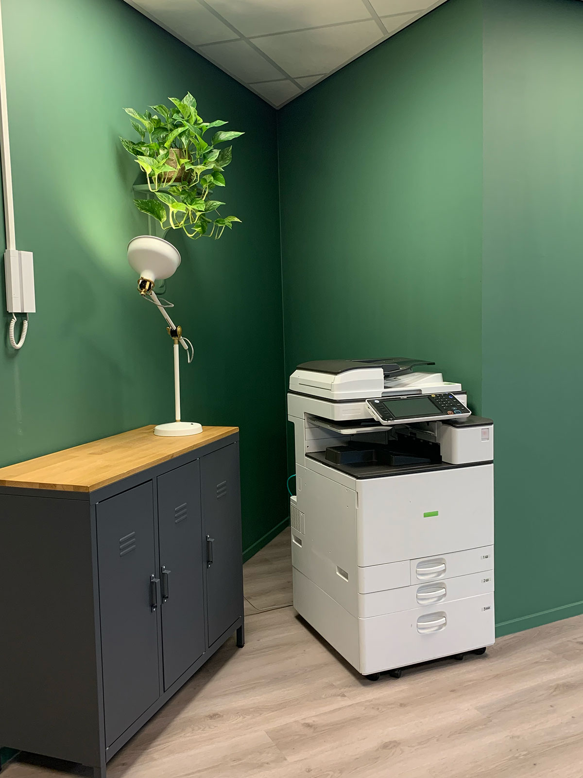 In plaats van losse, verspreide decoratieve elementen koos ik ervoor om karaktervolle details – zoals antieke schoolspullen die her en der uitgestrooid leken op vensterbanken – te groeperen tot sterke visuele statements. Zo versterken ze beter het verhaal van de organisaties. Een manshoog telraam kreeg een tweede leven als groene roomdivider, aangekleed met hangplanten. Een fraai bewerkte vintage salontafel doet nu dienst als plantentafel in een van de vergaderruimtes, wat zorgt voor een onverwacht huiselijk accent. Ook de entree en hal kregen een metamorfose. Daar creëerde ik, met verf, planten en sfeervol meubilair, een plek die aanvoelt als een terras. Geen buitenruimte waar eigenlijk zoveel behoefte aan was? Dan halen we buiten gewoon een beetje naar binnen.